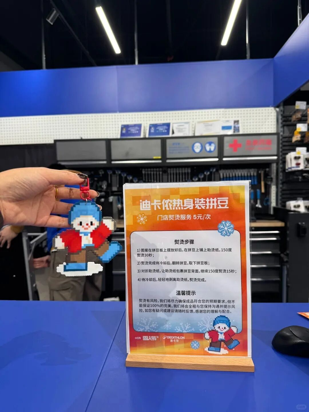 不仅有水裹汤泉、V汤泉生活馆这样的洗浴休闲中心,直接在休息区加入了拼豆,就连迪卡侬这样的线下运动零售都借势推出了拼豆主题的营销活动。