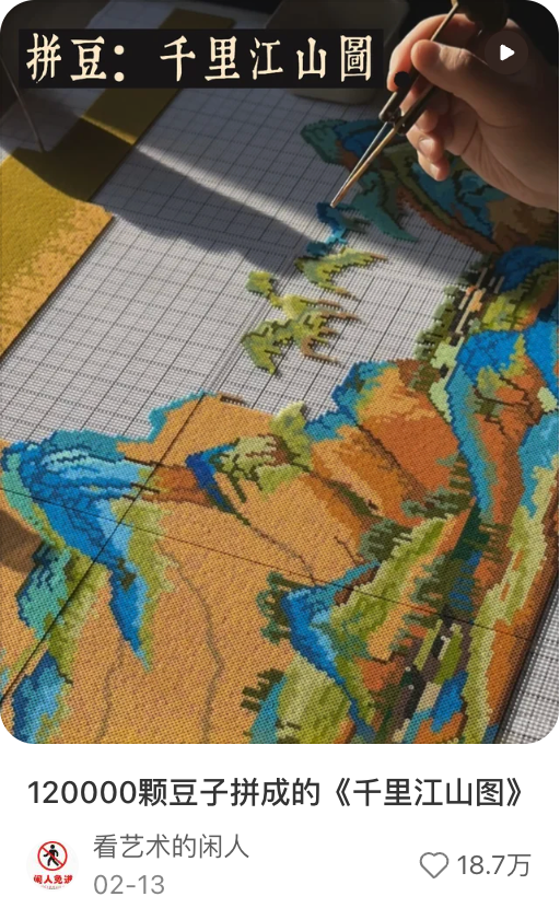 城里的拼豆店整个春节无休,甚至生意好到一座难求;社交平台上,还有各种拼豆视频动辄收获大几万点赞。