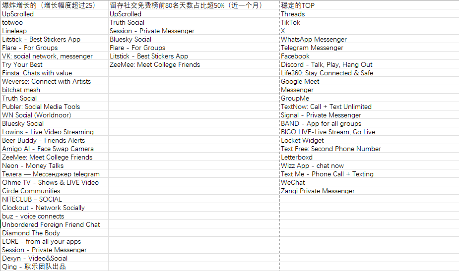 从2月1日到3月1日,在北美社交免费榜涨幅超过25位次的APP超过30个,但大多只是昙花一现。这些新星里,月内在TOP80内呆够15天的,只有7个应用,轮替速度非常快。