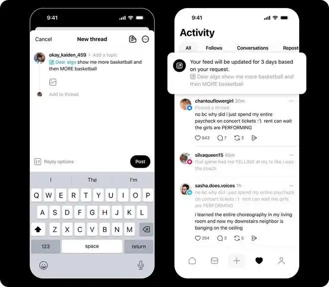 与此同时,Threads对于用户体验的持续开发,也是用户能够扎根于此的原因。今年2月,Threads在美国、英国、澳大利亚、新西兰推出新功能“Dear Algo——"的测试版:由AI驱动、能够让用户自定义推荐算法。