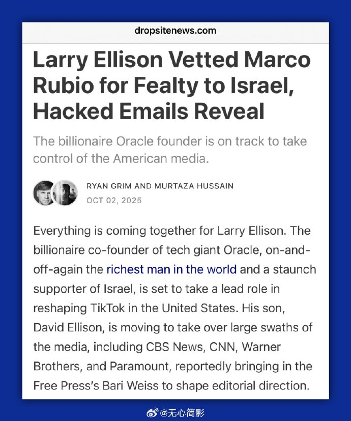 这封邮件的内容显示,甲骨文公司创始人拉里・埃里森早在2015年便核查过现任美国国务卿马尔科・鲁比奥对以色列的忠诚度,还为鲁比奥的竞选活动注资数百万美元;他曾向托尼・布莱尔研究所捐赠3.5亿美元,还承诺与特朗普携手助力“新加沙”重建,至今仍是以色列在美国的最大支持者之一。