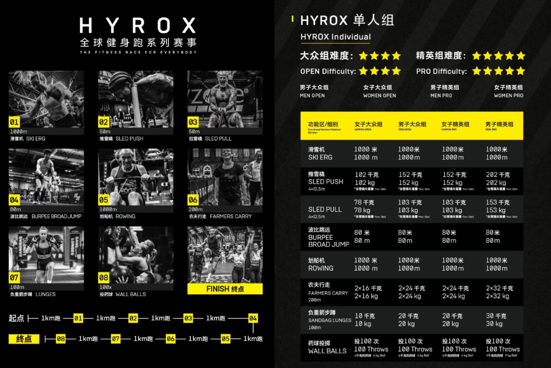 HYROX就在这样的背景下诞生了,作为一个为健身人群打造的比赛,它也融合了健身房里最常见的两项运动:有氧和力量。