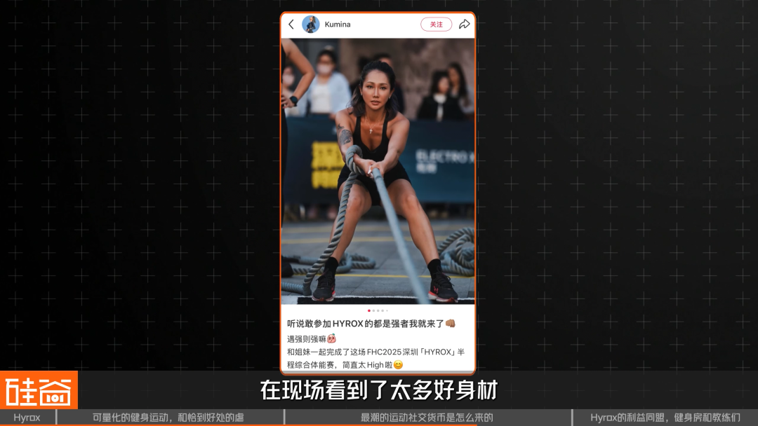 在12月底HYROX举办深圳站比赛时,小红书上就有不少人在讨论,在现场看到了太多好身材,而在读图时代,这恰恰成为了一种足够诱人的内容。