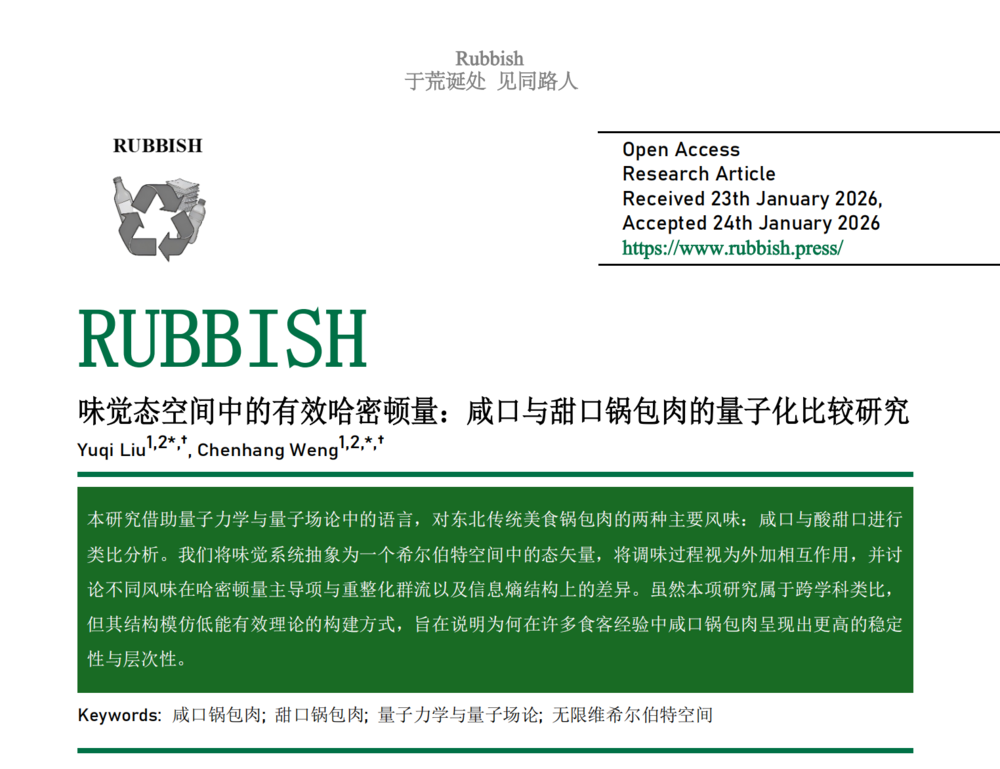 《味觉态空间中的有效哈密顿量:咸口与甜口锅包肉的量子化比较研究》的作者,更是一位老吃家。