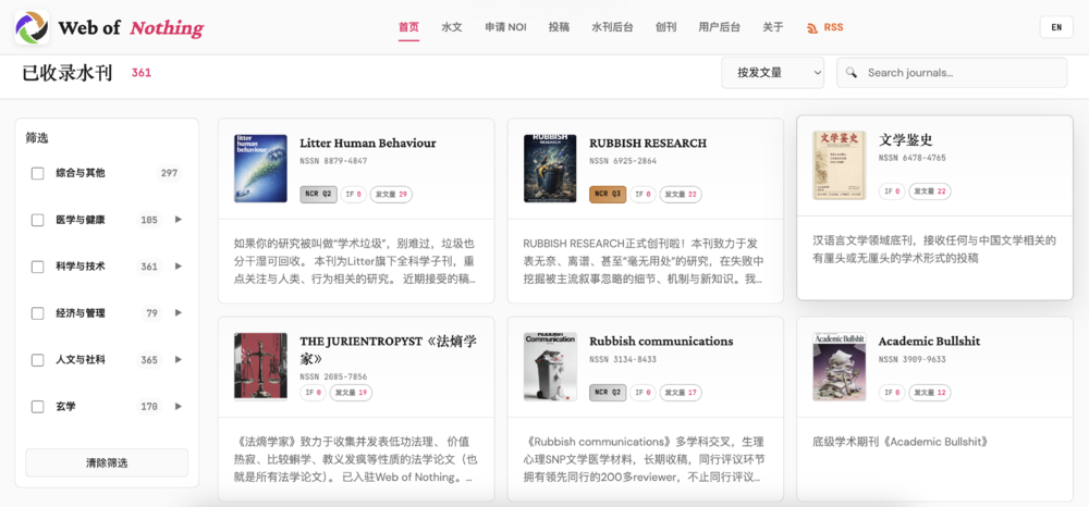 有需求就有市场,在弱智论文领域,对标期刊索引平台web of science的web of nothing(简称WON)都出现了。