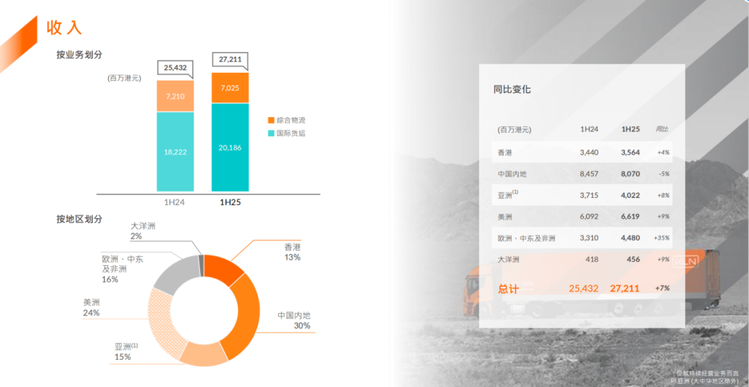 稳健的经营基本面为并购提供了支撑。KLN 2025年中期报告显示,公司上半年收入272.11亿港元,同比增长7%;核心经营溢利与核心纯利分别增长12%,达到13.48亿港元与6.81亿港元,其中国际货运业务表现亮眼,同比增长22%至9.19亿港元。