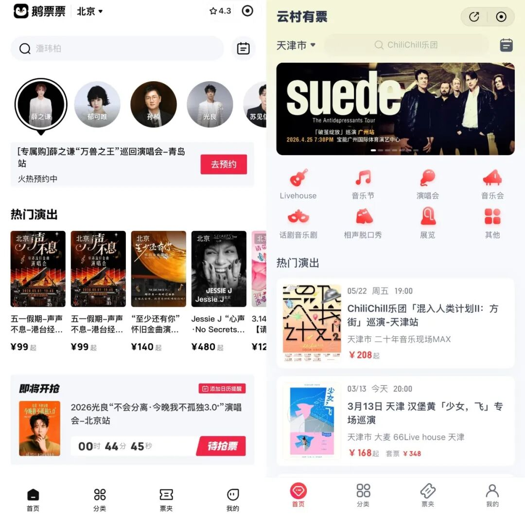 仔细看来,鹅票票的结构类似网易云站内的云村有票,功能与覆盖品类都高度重合。不同的是,云村有票是网易云音乐在站内打造的票务聚合入口,更专注于整合第三方资源,并未在站外上线相关服务。