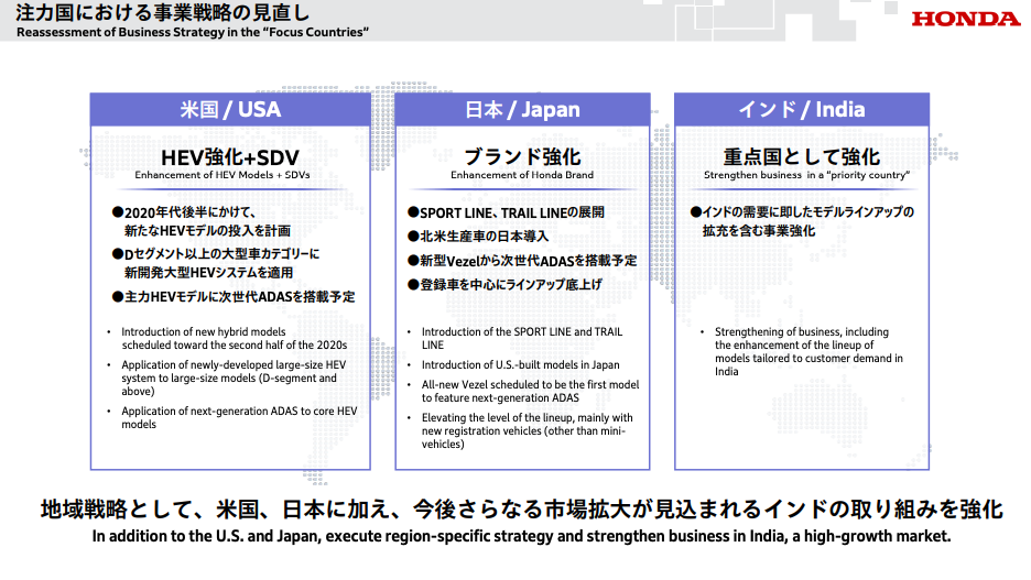 本田明确了三个市场的定位:日本和美国是主战场;印度市场增长潜力大,要加强车型阵容和成本竞争力;中国市场需要"重新评估资源分配"。这个信号很明确:中国市场竞争太激烈,投入产出比不划算。