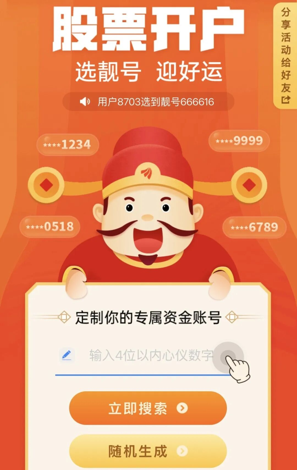 东方财富证券——下载东方财富证券App,首页搜索“666”或“选号”进入活动,输入心仪的4位数字(资金账号末4位),选择靓号,完成开户流程。