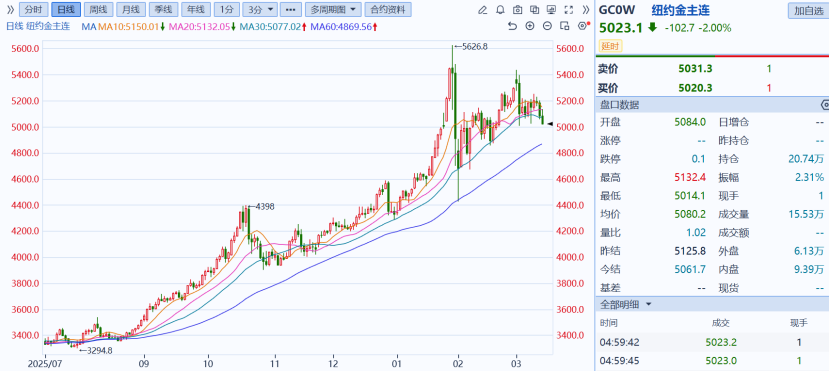 3月3日,金价单日大跌4.46%。随后虽有小幅反弹,但很快又掉头向下,接连放量回调。最近短短两天,金价累计跌去200美元,目前正死守5000美元的核心防线。