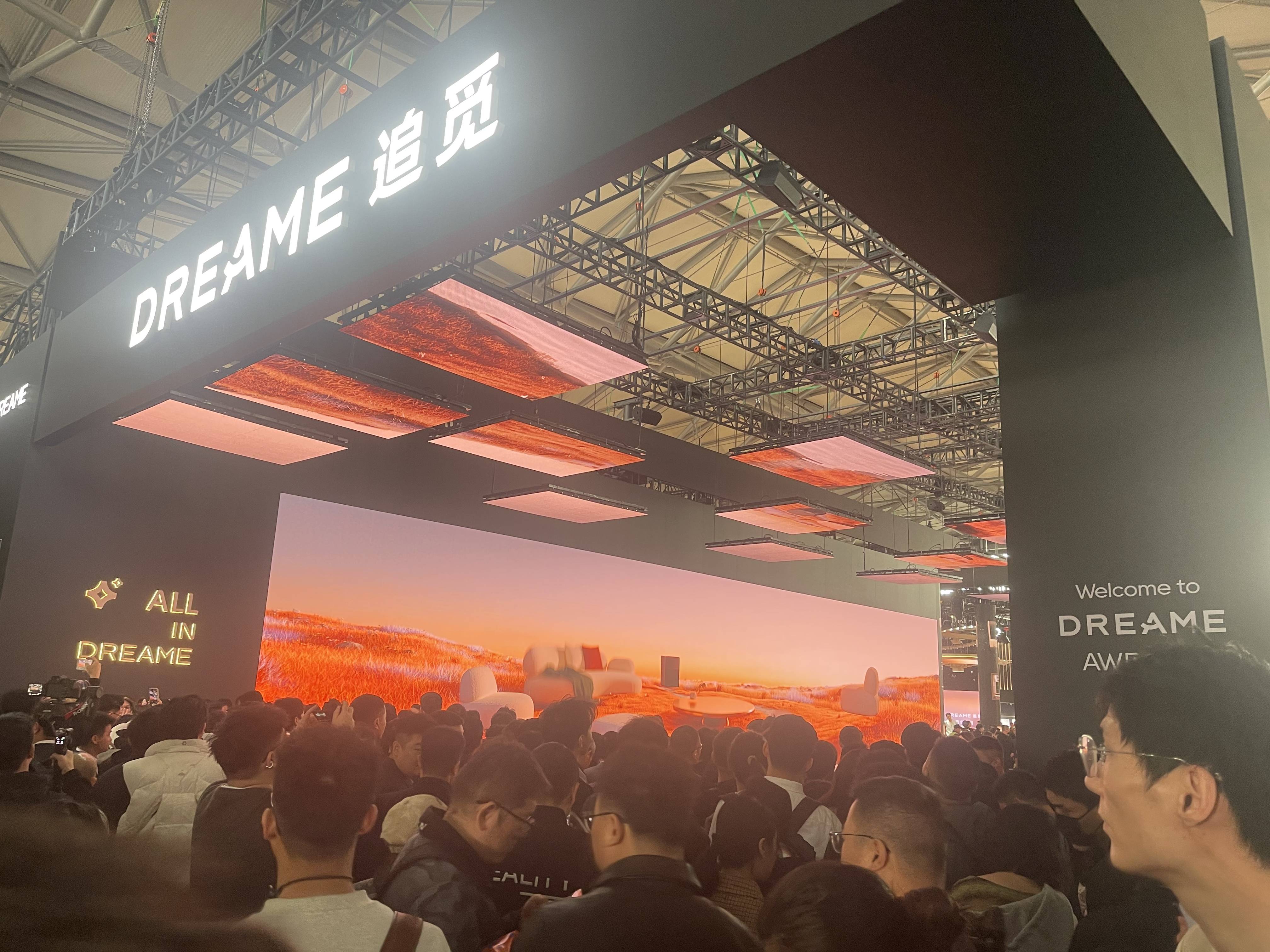 这些展位里重复出现着跑车、飞机元素,试图营造一种极致的科技感。我试图挤进追觅的包馆一探究竟,却被汹涌的人群挤到了角落;想找入场口,却被告知需要在这嘈杂拥挤的队列里等待排队放行。这种“流量焦虑”,恰恰暴露了新贵急于证明自己的迫切心态。