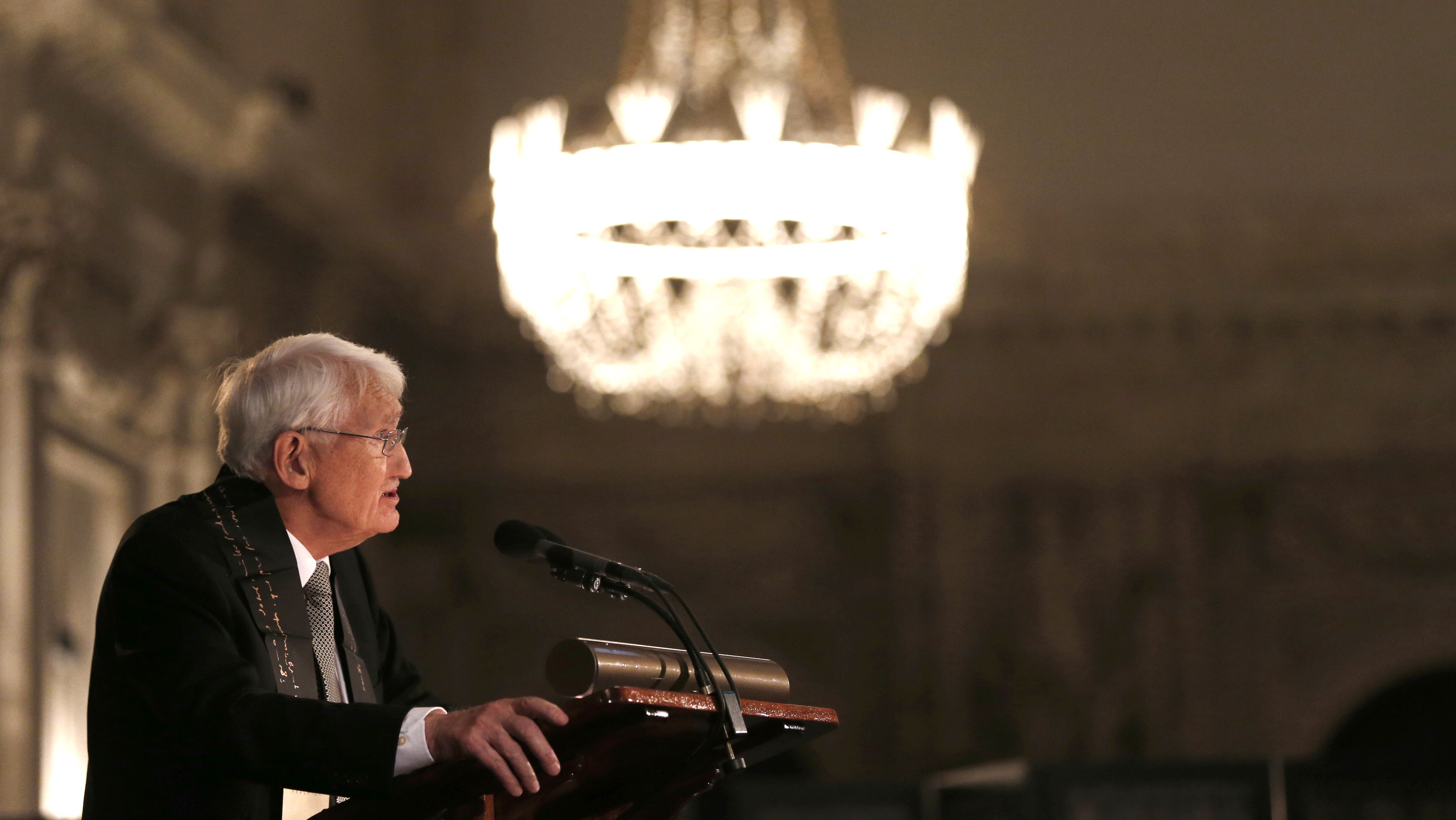 过去的几十年来,人们或褒或贬地给过于尔根·哈贝马斯很多标签:“现代性卫士”、“交往理论大师”、“国家政治文化的公共良心”、“联邦共和国的黑格尔”、“法兰克福的烈性子”,以及“德国思想导师”等等。2012年5月,他到维也纳被同时授予两个奖项——“埃尔文·查戈夫奖”和“维克多·弗兰克奖”——的时候,我远远地瞻望过他。当时83岁的他神情淡然,已经免疫于一切颂扬。他的先天破损的脸会让乍见之下的我感到吃惊,但也马上习惯了,对于熟稔霍金在轮椅上的形象的人来说,已经不会有更差的学者样貌了。