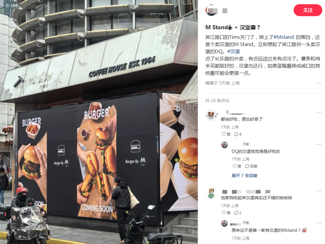 最近不少网友留意到,M Stand在上海、南京、成都多地均有门店在围档中,品牌的手作汉堡店或将在不久后和消费者见面。