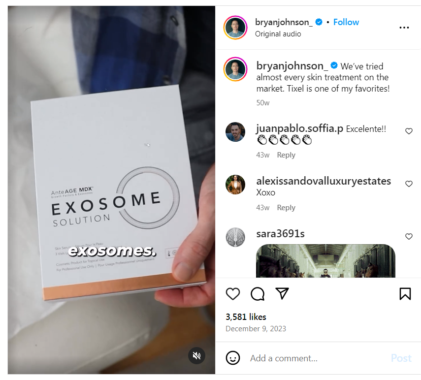 当然,抗衰网红/换血富豪布莱恩·约翰逊(Bryan Johnson)也没错过这个潮流。他把外泌体用来快速镇定皮肤以及防止秃头。