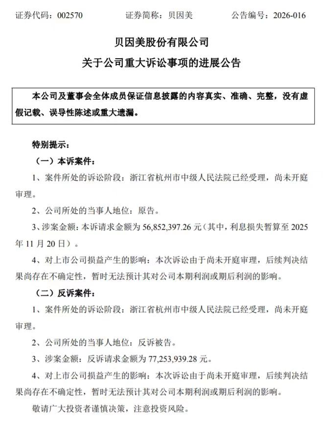 2月24日晚间,贝因美股份有限公司发布《关于公司重大诉讼事项的进展公告》,披露公司涉专利合同纠纷案件的最近进展,其中被告方黑龙江丰佑麻类种植有限公司提起的反诉涉案赔偿金额超7700万元,相关事项已获法院受理。