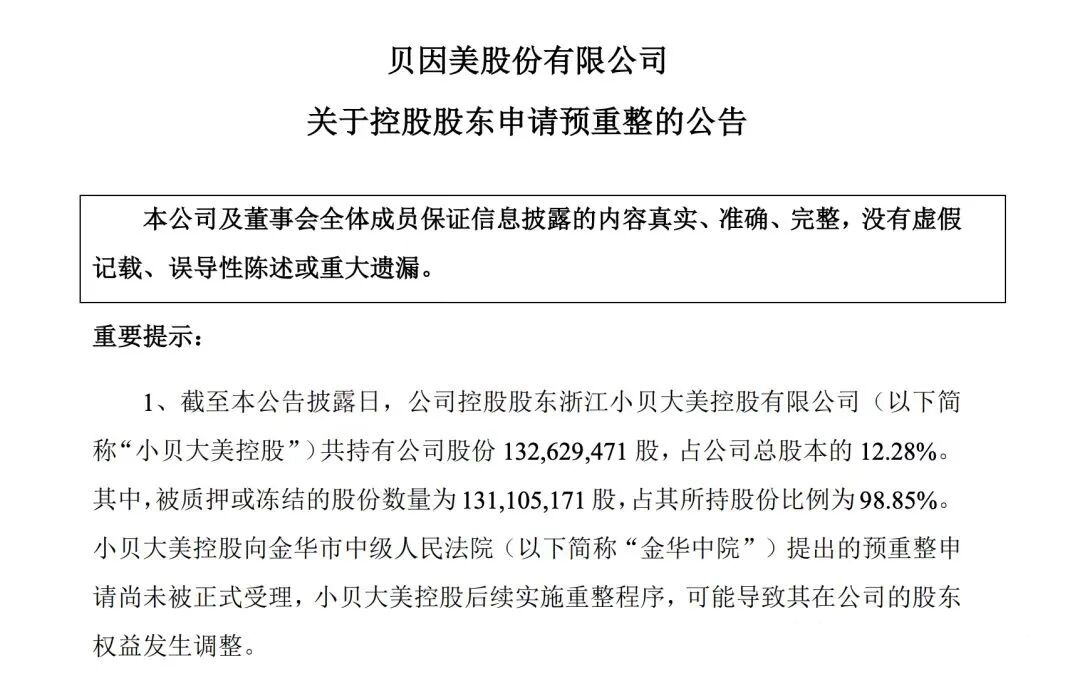 在股东层面,控股股东浙江小贝大美控股有限公司在2025年7月因流动性紧张、无法清偿到期债务申请预重整,其持有的贝因美12.28%股份中,超过98%已被质押或冻结。