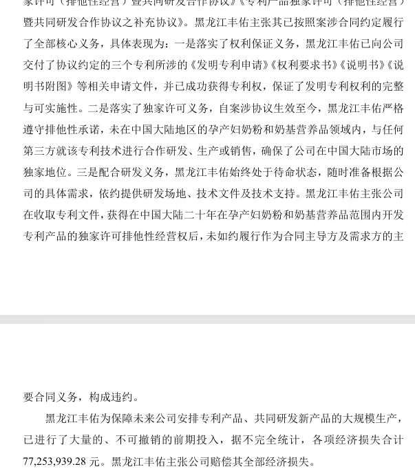 黑龙江丰佑则是反手一个投诉,完全否认违约,称已交付三项专利的全部技术文件、成功获得专利权、严格履行排他承诺,且为配合贝因美量产做了大量不可撤销投入,是贝因美自身放弃推进,构成根本违约,随即提出反诉,索赔金额高达7725.39万元,闹得满城风雨。