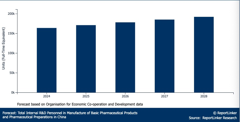 未来,中国医药行业内部研发人员数量将持续增长。根据ReportLinker网站的报告,从2024年的16.369万人,增加到2028年的19.194万人,年均复合增长率约4%。