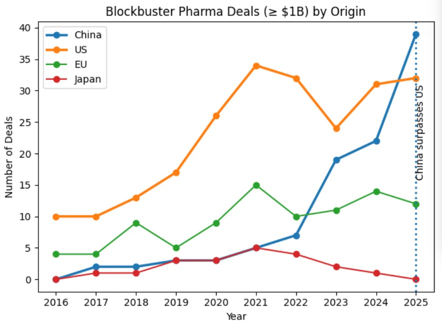 2025年,中国在全球授权交易额中所占份额达到约50%,而美国则降至约27-28%。