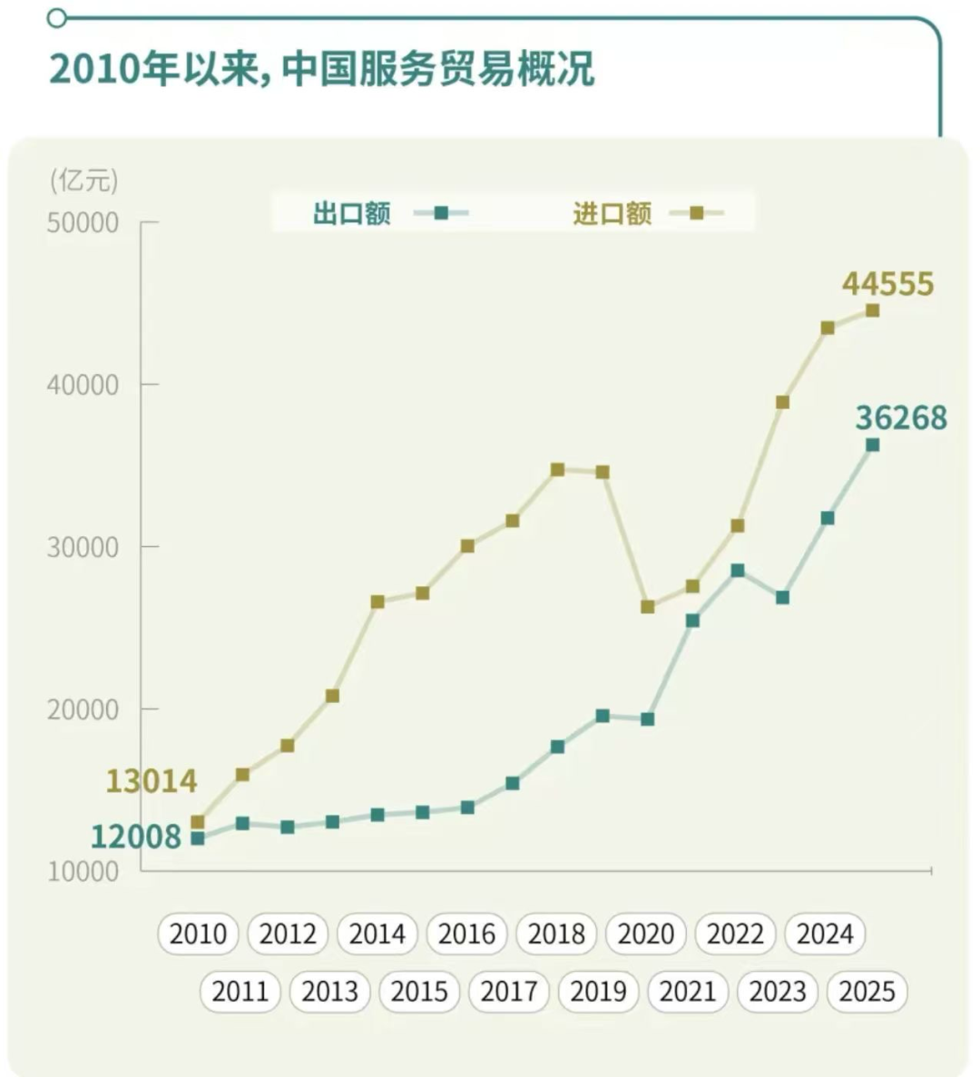 2025年,服务贸易逆差8287.2亿元,较上年减少3439.5亿元。