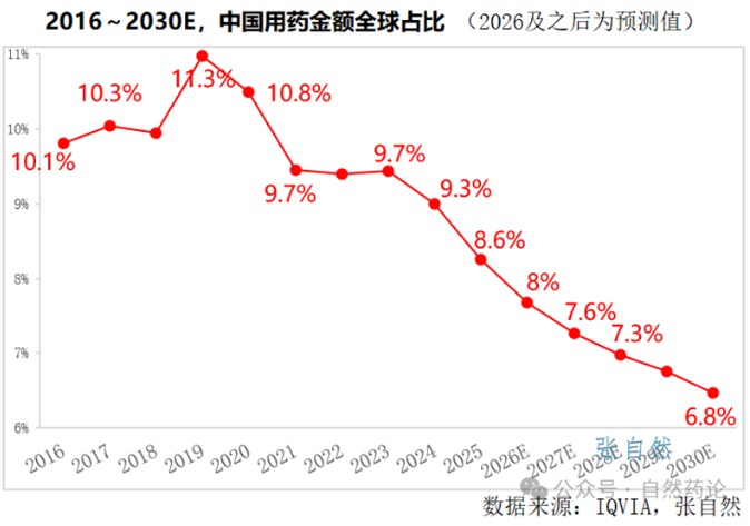 2019年之前用药金额连年上升,在全球占比达到11.3%的历史峰值,2019年之后逐年下降,到2025年下降到8.6%。预测到2030年,我国用药金额在全球的占比将进一步下降到6.8%。