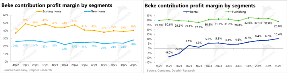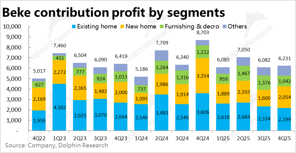 因而合计家装、租赁和其他新业务的二航道整整体贡献利润本季同比增长了约13.5%,部分对冲了一航道贡献利润的大幅下滑。