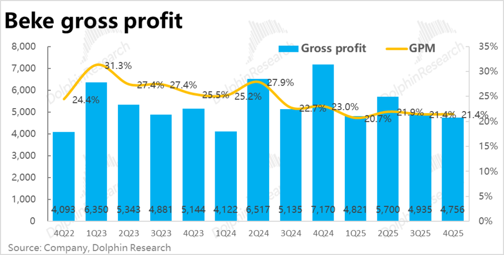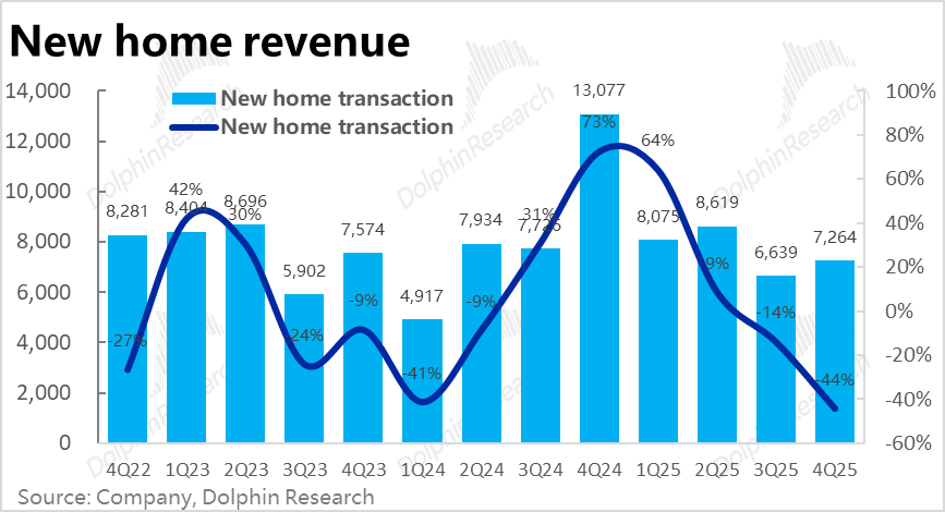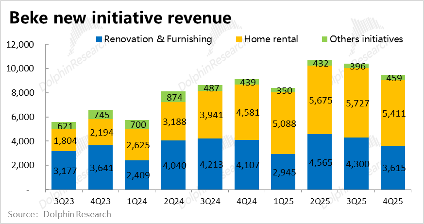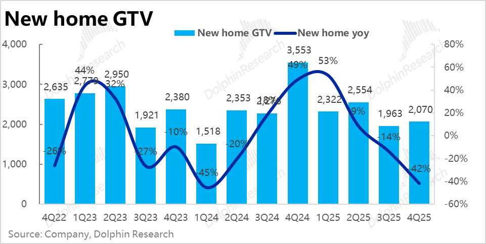 新房销售的压力则更大一些,本季GTV同比下降42%,高于彭博一致预期的39%。且根据百强房企销售数据,在25年10~12月内同比跌幅在30%~40%之间。连续多个季度可见,贝壳在新房销售上的增速已经不再跑赢行业了。