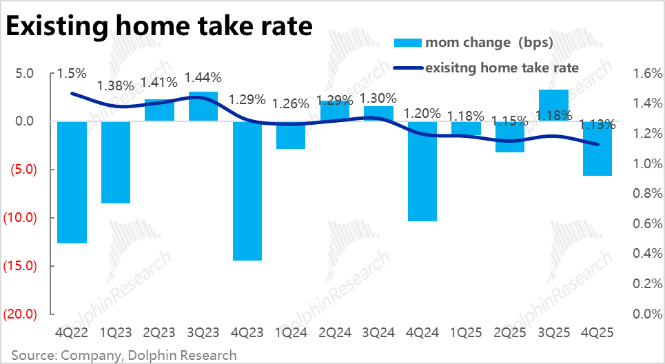 至于新房业务的综合变现率本季为3.5%,环比角度随季节性有所提升(可能是因房企年末冲业绩),但同比仍是下跌了17个基点。因此,新房业务的营收同比降幅业务比GTV更严重,达到-44%。