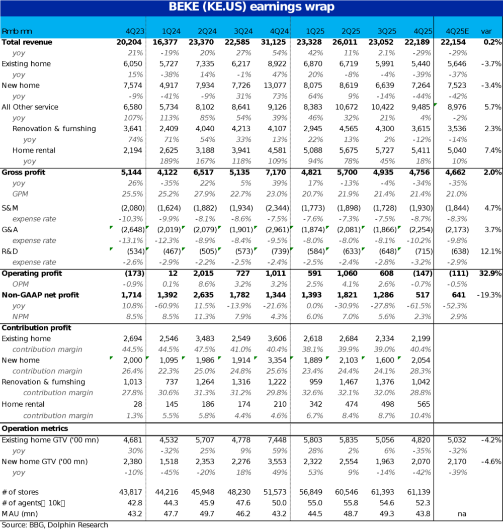 国内住房中介龙头——贝壳今晚(3.16)美股盘前,公布了25年最后一季财报,整体来看由于24年9月新政后的极高基数,叠加25下半年后楼市持续走弱,在巨大行业逆风下,贝壳本季度是相当惨淡的,具体来看: