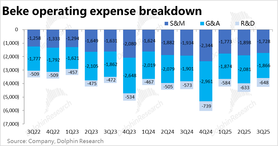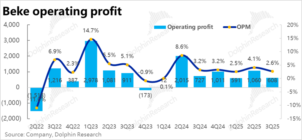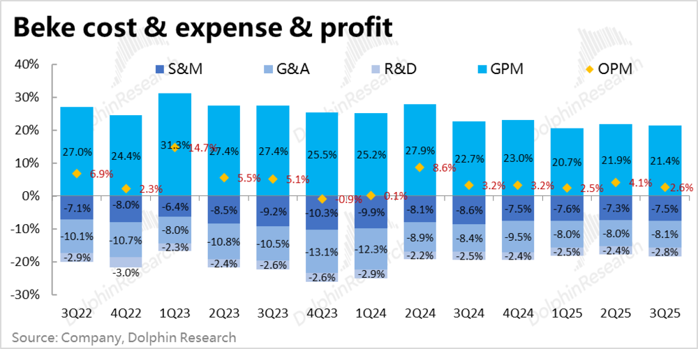 面对恶劣的行业环境和增长压力,贝壳本季的在优化费用的力度更强,本季经营费用合计同比下滑了约20%。具体来看,营销和管理费用的同比跌幅都在20%上下。只有研发费用相对刚性,只同比下降了约3%,应当是研发AI等相关功能投入(如全景看房、AI装修等)的需要。