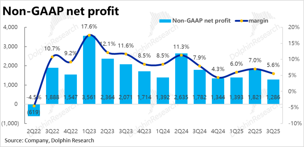 同时,公司虽已加大了控费力度,本季经营费用合计同比下滑了约20%,但因收入和毛利润的同比跌幅更大,费用率被动扩大。使得本季GAAP下经营利润扭盈为亏近1.5亿。