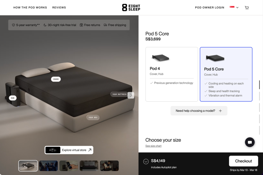 但公司的财务状况很糟糕,2025 年第三季度净亏损 4000 万美元,同店销售额下滑 17% 到 20%。它的智能床需要整张更换,起价 3399 美元,跟 Eight Sleep 的「套上去就行」相比,购买门槛高很多。