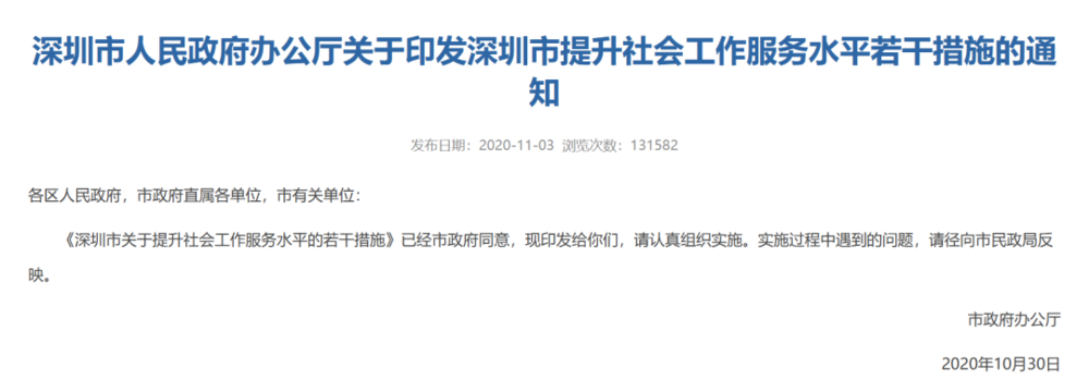 ▲2020年,深圳发布《深圳市人民政府办公厅关于印发深圳市提升社会工作服务水平若干措施的通知》