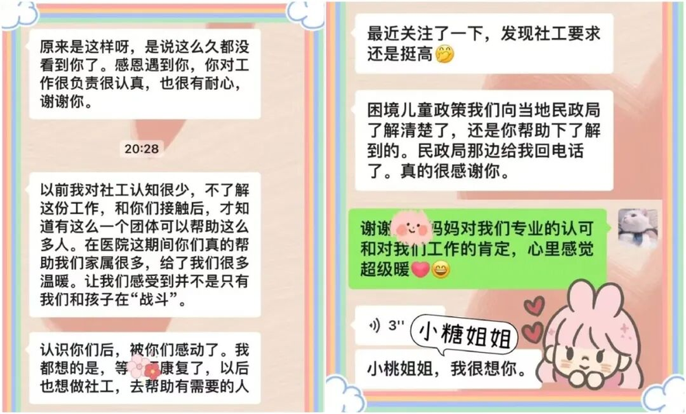 唐恬也曾摇摆过。支撑她走下去的往往是服务过程中无数细小但直接的正反馈。每年过节,唐恬会收到不同家长发来的语音,点开来,播放出的是孩子稚嫩的声音,祝她节日快乐。发现服务对象在帮助下产生正向改变后,随之而来的成就感也会让唐恬觉得自己的工作是有价值的。
