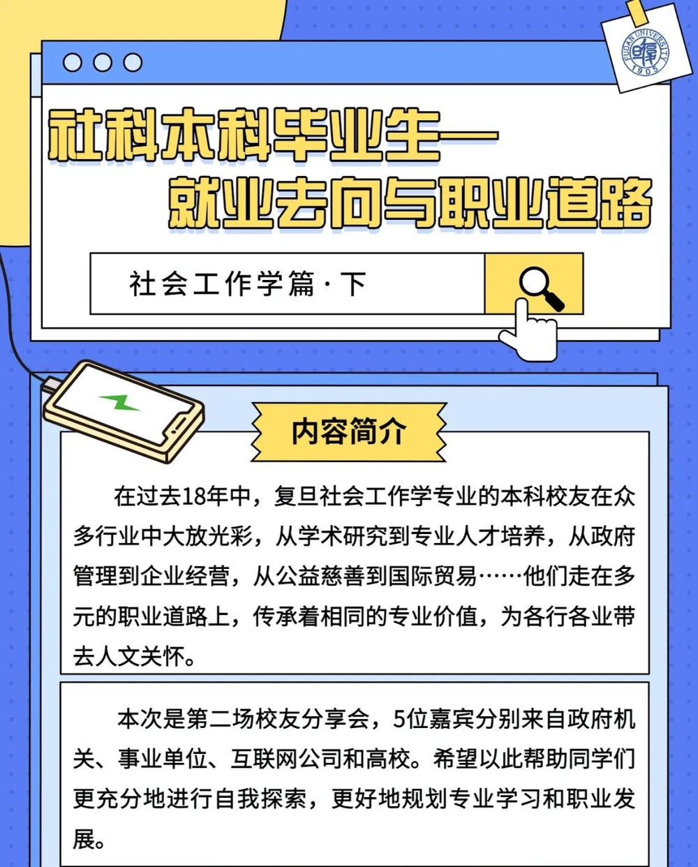 ▲复旦社会工作专业本科毕业生就业去向与职业道路分享会海报/图源:公众号复旦社工