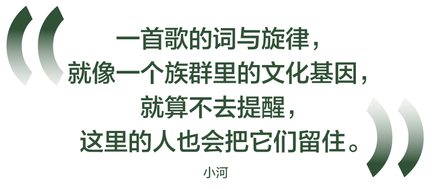 “一首歌的词与旋律,就像一个族群里的文化基因,就算不去提醒,这里的人也会把它们留住。”音乐像无形的线,串联起不同世代的人,小河渐渐不再担心这些与“地方”有关的东西会消失。