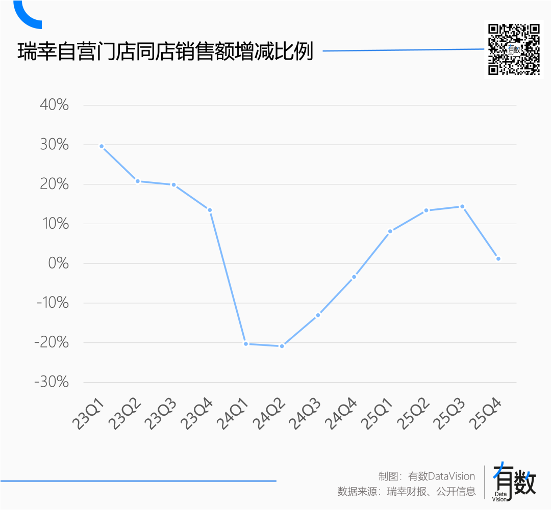 除了整体利润承压,作为盈利基本盘的成熟门店也略显疲态。二季度时,同店销售额尚能维持14.4%的增速,至四季度只剩1.2%,单店创收的引擎也有点扛不住了。