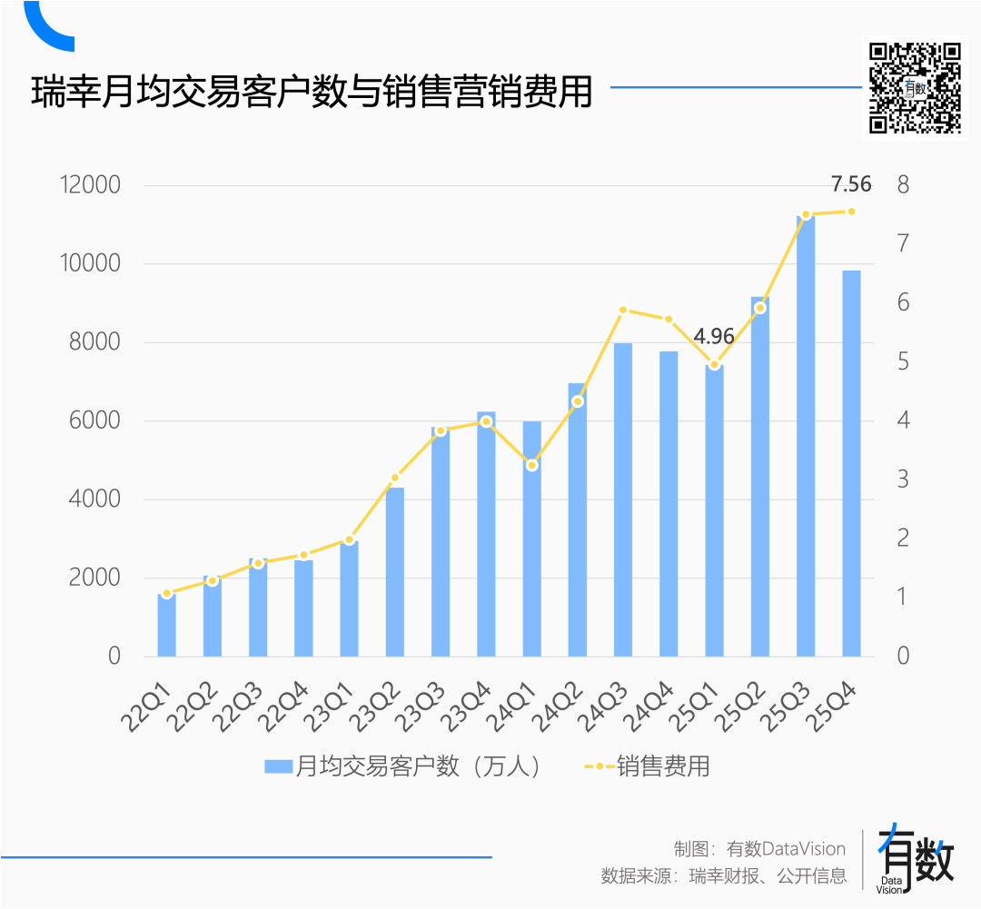 到了三季度,瑞幸月均交易用户冲上1.12亿,同比大增40.6%[1]。四季度是现制饮品行业的传统淡季,月均交易用户回落到1亿以下。但这两个季度,瑞幸的销售营销费用分别上升了27.5%和31.9%。