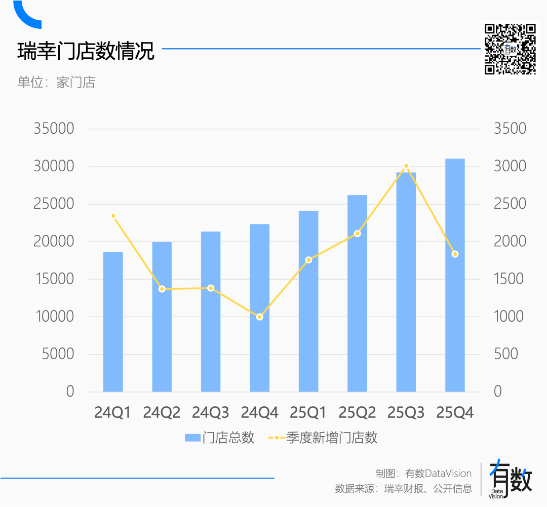 过去几年,瑞幸的开店速度一直在加快。2025年,瑞幸新增门店8708家,作为对比,星巴克国内门店数一共只有8011家[4],相当于瑞幸一年开出了星巴克20年的店。