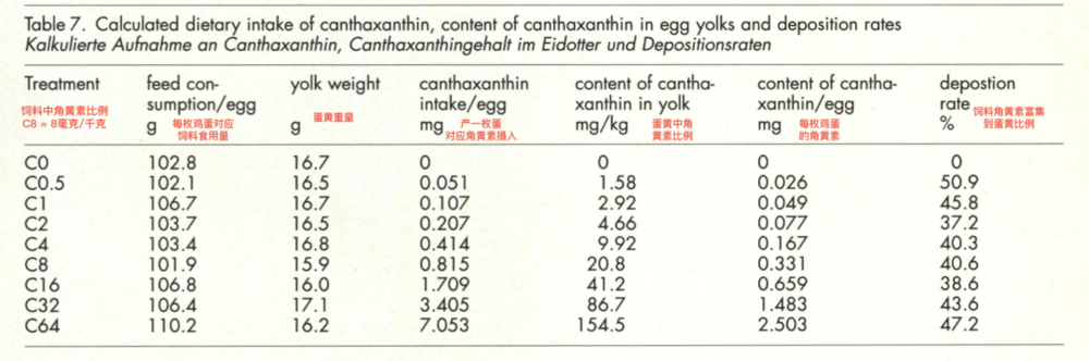 从有益鸡的健康角度,按规定的饲料里添加6-8毫克/千克角黄素就够了。我们也可以算一下合规鸡蛋里大概会有多少角黄素。