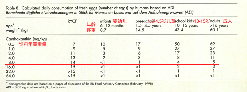 但在一些幼儿里可能会有问题,比如一个两岁的小孩,稍微轻一点,10千克体重,如果一天吃一个用了8毫克/千克角黄素饲料养的鸡蛋,刚好站在角黄素建议摄入上限上。