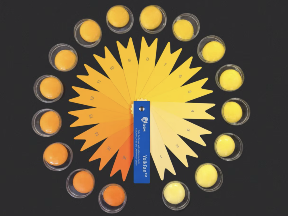 以颜色为例,蛋黄颜色有一个DSM标准,以前叫RYCF标准(过去是15色,现在鸡蛋颜色越整越深,加到了16色):