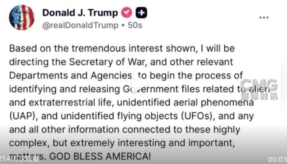 然而,他的澄清并未平息风波。五天后,现任总统特朗普在“空军一号”上对记者放话:“他(奥巴马)说出了机密信息……他犯了大错。”并随即在社交媒体上宣布,将指示国防部等部门,“全面识别并公开与外星人、地外生命、不明空中现象(UAP)和不明飞行物(UFO)相关的政府文件。”