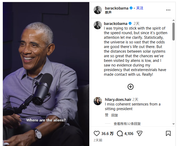 这句看似随意的评论,瞬间像一颗投入平静湖面的巨石,在全球网络激起千层浪。短短几小时内,相关片段被剪辑、转发,迅速登上热搜。或许是意识到此言的分量,奥巴马次日便在Instagram上紧急澄清:“从统计学角度看,宇宙如此之大,地外生命存在的可能性很大。但我在总统任期内没有看到任何外星人接触地球的证据。真的!”