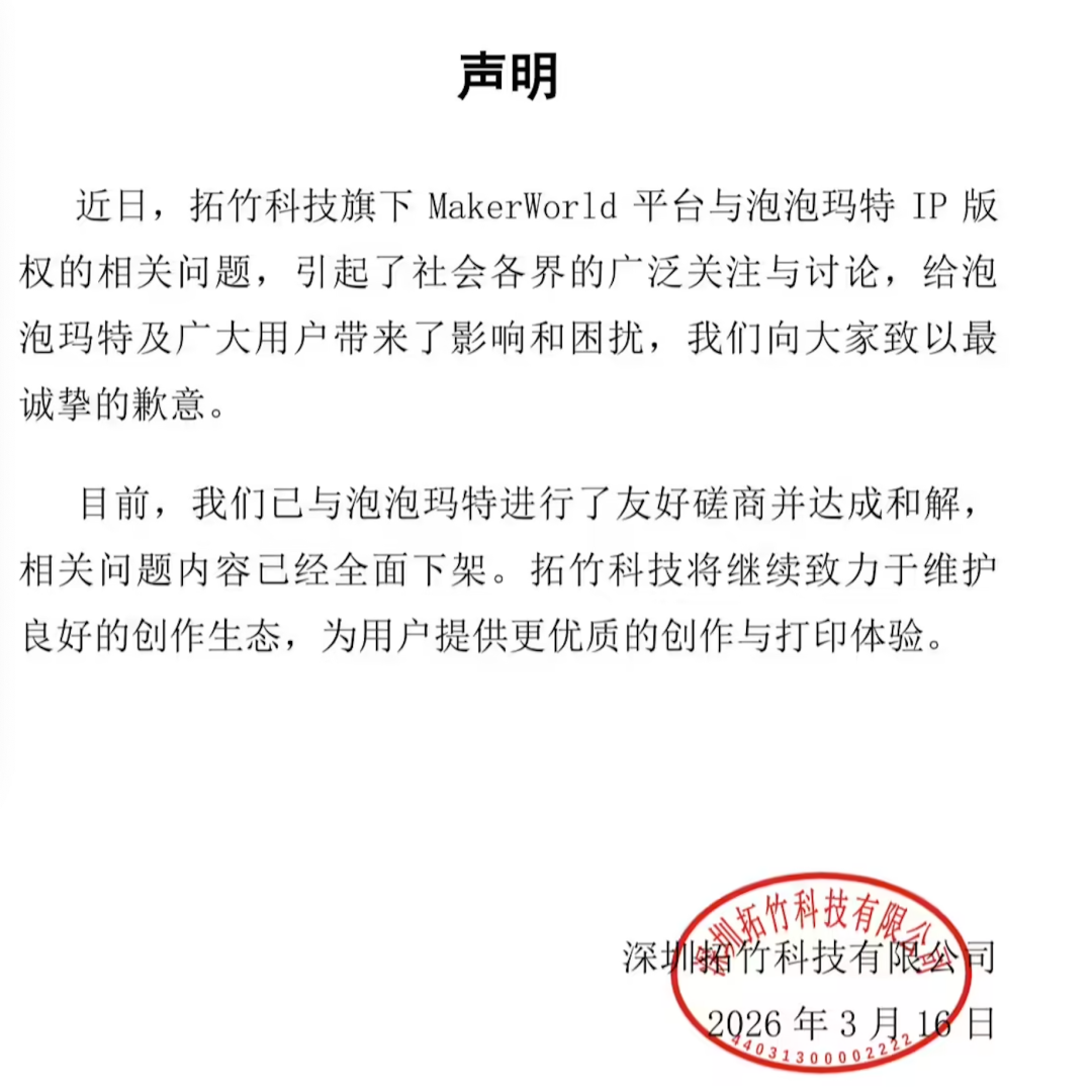 这场官司,如果将2025年5月泡泡玛特向拓竹发的第一封函为始,到2026年3月16日宣布和解的这一刻,就结束了。原定于4月2日的法庭对峙也随之取消,双方握手言和,风平浪静。