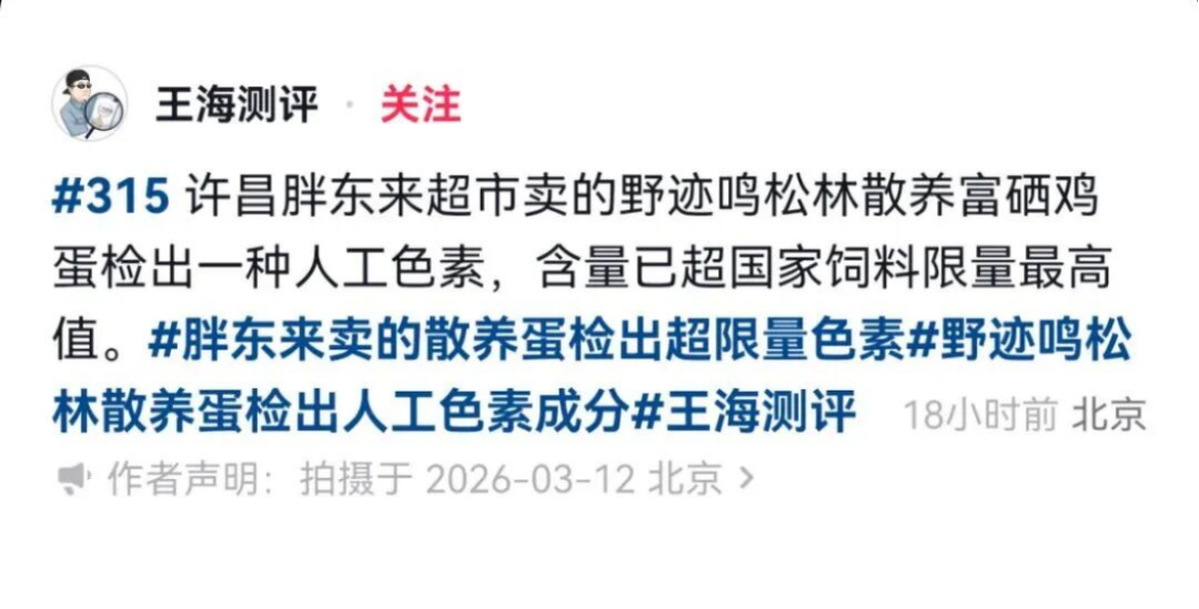 一场关于鸡蛋中角黄素是否超标的论战,在胖东来与打假人王海之间爆发。事件核心在于评判标准的适用性,以及企业如何面对监督——是坦诚纠错还是依法维权,这推动了行业标准与市场规则的透明化。 ## 01 打假人送检“发难”,胖东来突陷“色素门” - **指控缘起**:2026年3月13日,王海团队发布视频,称在胖东来购买的10款鸡蛋均检出角黄素,其中“野迹鸣富硒蛋”含量高达9.54mg/kg,并依据饲料添加剂标准(≤8mg/kg)判定其“超标”。 - **胖东来回应**:胖东来于3月15日声明,指出王海团队适用标准错误,因国家无鸡蛋中角黄素残留量的标准,用饲料标准评判鸡蛋产品不科学、无法理依据。 - **安全风险测算**:中国农业大学副教授朱毅引用国际标准测算,指出一个60kg成年人日食4枚“野迹鸣”鸡蛋即超安全摄入上限,儿童风险更高。 - **自证与对峙**:胖东来已将涉事鸡蛋送三家权威机构复检,并表示将根据结果决定下架赔偿或起诉王海团队。 ## 02 黄天鹅称检出角黄素为“天然含量”,王海驳斥“胡扯” - **品牌方解释**:涉事品牌黄天鹅的母公司声明,检出的角黄素是天然含量,并称每年投入上千万元使用万寿菊等天然植物为蛋黄上色,人工添加角黄素成本极低且无必要。 - **打假人反驳**:王海直斥该说法“胡扯”,称科学共识认为天然饲料色素不含角黄素,国内外市场也无天然提取的角黄素,将其解释为天然来源缺乏依据。 ## 03 当胖东来遇上王海 - **胖东来的应对哲学**:面对属实问题,如2024年餐饮卫生不达标和隔夜三文鱼事件,胖东来高额奖励顾客并巨额赔偿;面对不实指控,如“红内裤事件”和“柴怼怼事件”,则坚决通过法律诉讼维权并胜诉。 - **王海的打假轨迹**:王海曾成功曝光辛巴假燕窝、打假东方甄选西梅汁等,但也曾因指控彩虹星球产品不当而在一审、二审中均被判败诉,需公开道歉。 - **论战的本质**:此次鸡蛋风波最终需依靠科学检测与法律裁决,企业与监督者的良性互动应成为推动行业标准清晰化和市场规则透明化的力量。