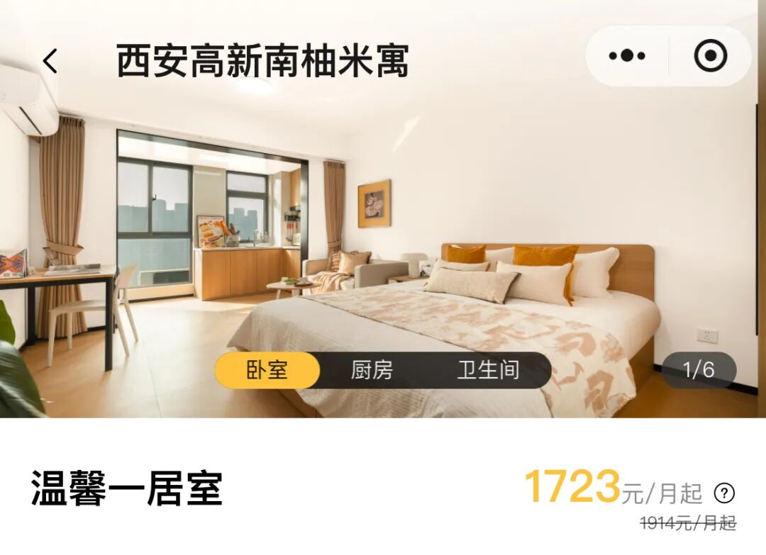 同样拥有房企基因的柚米寓,月租高于泊寓。西安高新南柚米寓30平方米左右户型月租1723元,更宽敞的一居室逼近2000元,一室一厅达2200元。与泊寓相比,柚米寓更聚焦有做饭需求的租住客群,在产品定位上形成差异化。