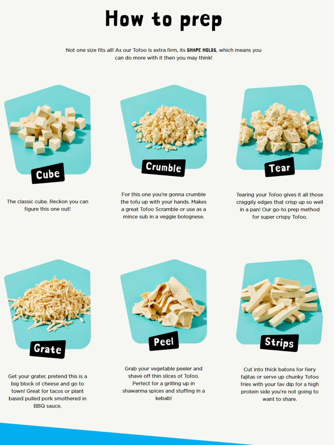 The Tofoo Co官网“How to prep”页面:教你6种豆腐处理方式——切块(Cube)、掰碎(Crumble)、手撕(Tear)、刨丝(Grate)、削片(Peel)、切条(Strips),每种都配上具体的使用场景建议。