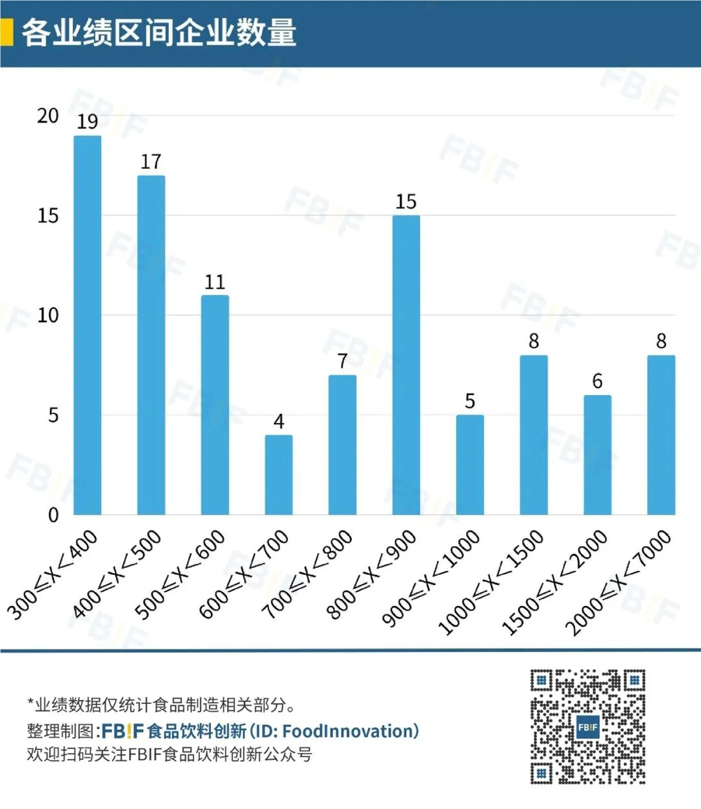 从各业绩区间企业数量的分布来看,FBIF全球百强榜整体呈现出中尾部区间拥挤,头部区间分散的格局。