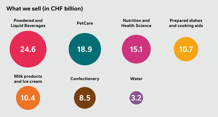 以雀巢为例。2024年财报显示,雀巢共有7大业务板块,其中,粉状及液体饮料、乳制品及冰淇淋、营养与健康科学、预制菜肴及烹饪辅料、宠物护理(宠物食品不计入榜单业绩)5个板块的营收都超过100亿瑞士法郎。